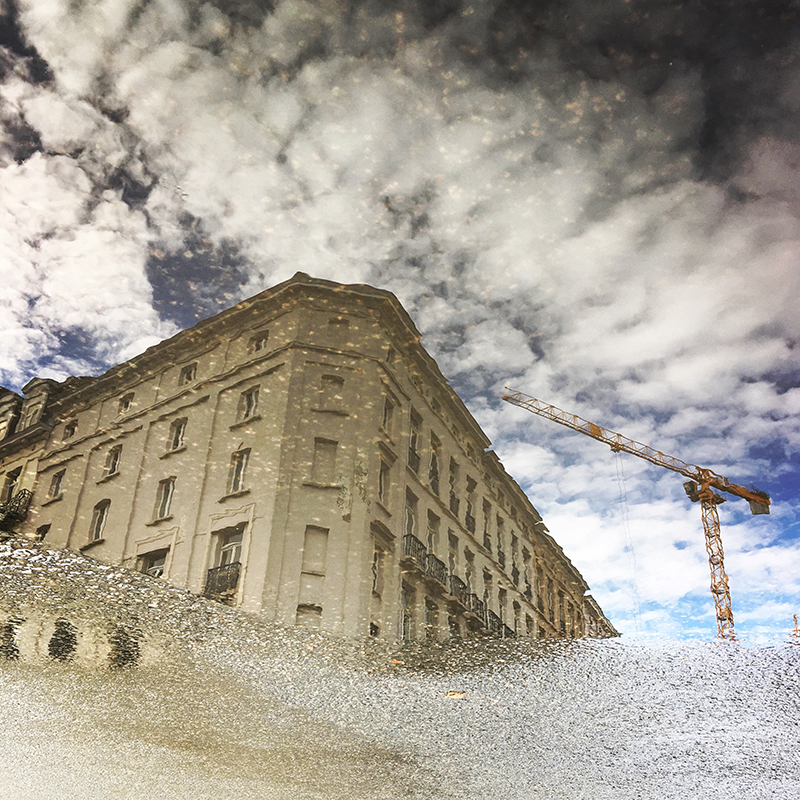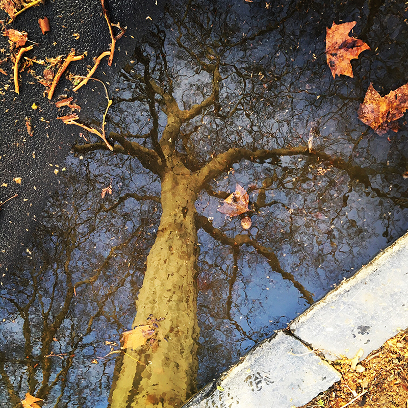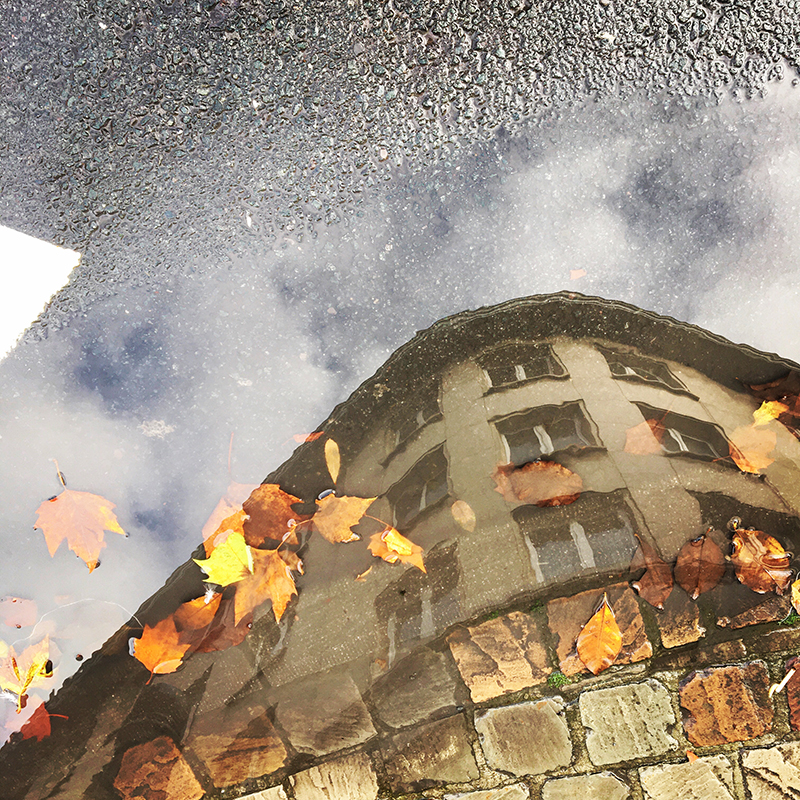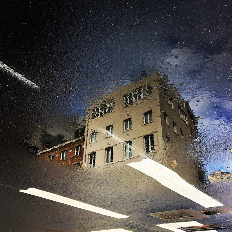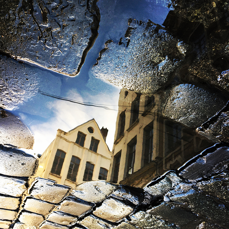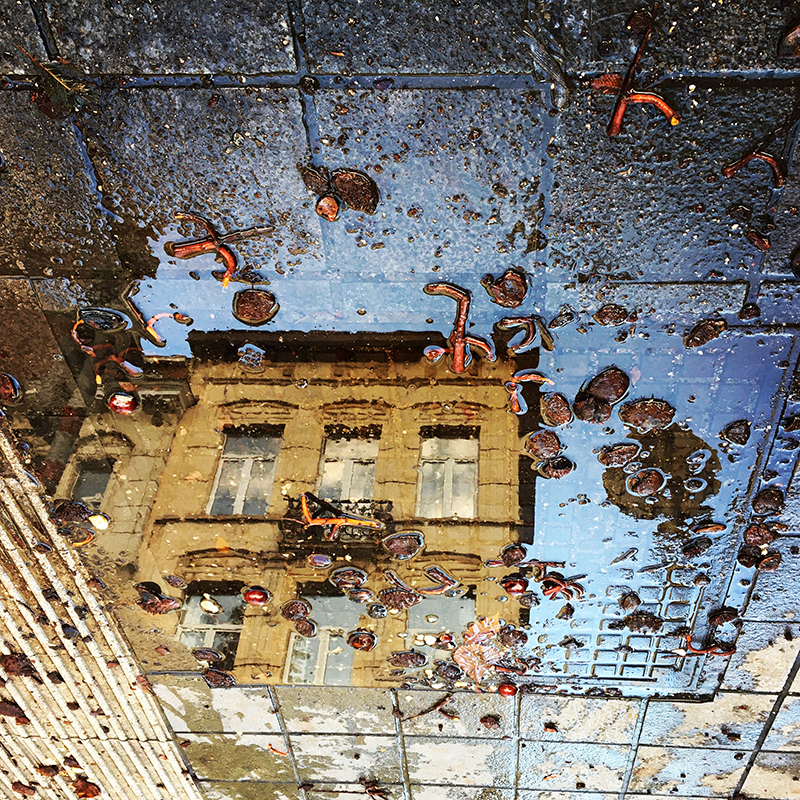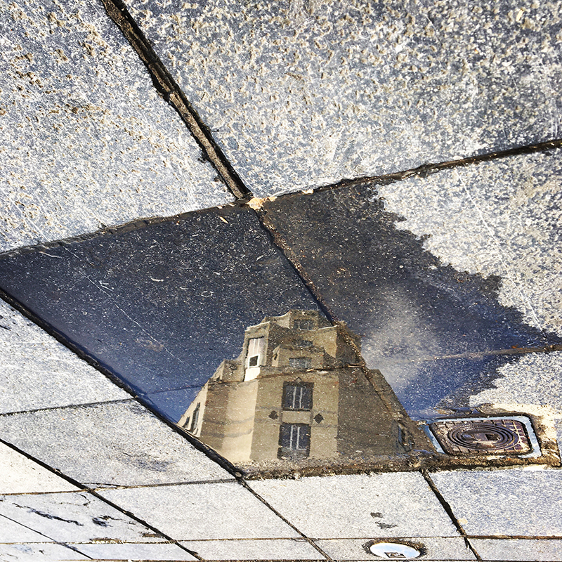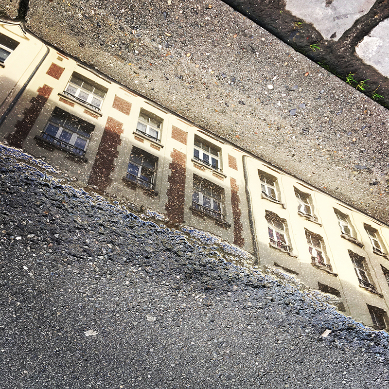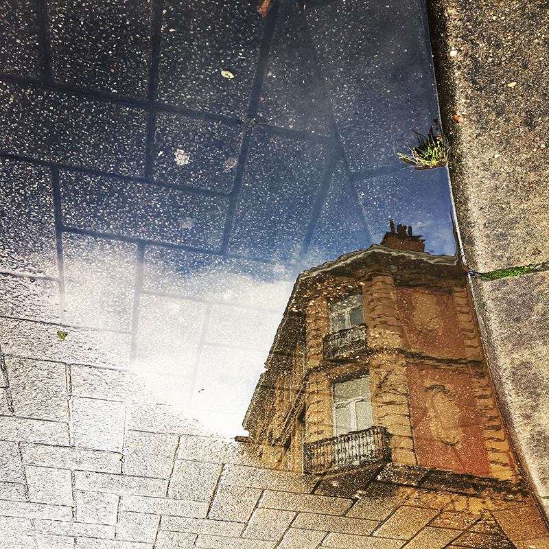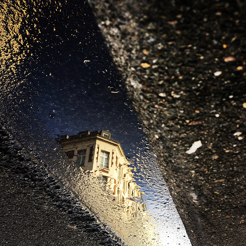 Je ne sais pas vraiment ce qui me plaît le plus dans les flaques. Est-ce leur côté éphémère ? Cette magnifique façon d’apparaître et de disparaître petit à petit. Leurs reflets qui peuvent être, selon le sens dans lequel on les regarde, complètement différents. Ou est-ce la superposition de deux univers qu’elles me laissent voir, l’espace d’un instant ? J’aime attendre la fin de l’averse pour partir découvrir cet autre monde qui me surprend toujours autant, quelque soit le jour ou la saison. Après la pluie, deux mondes vivent en suspension et on ne sait plus où mettre les pieds.