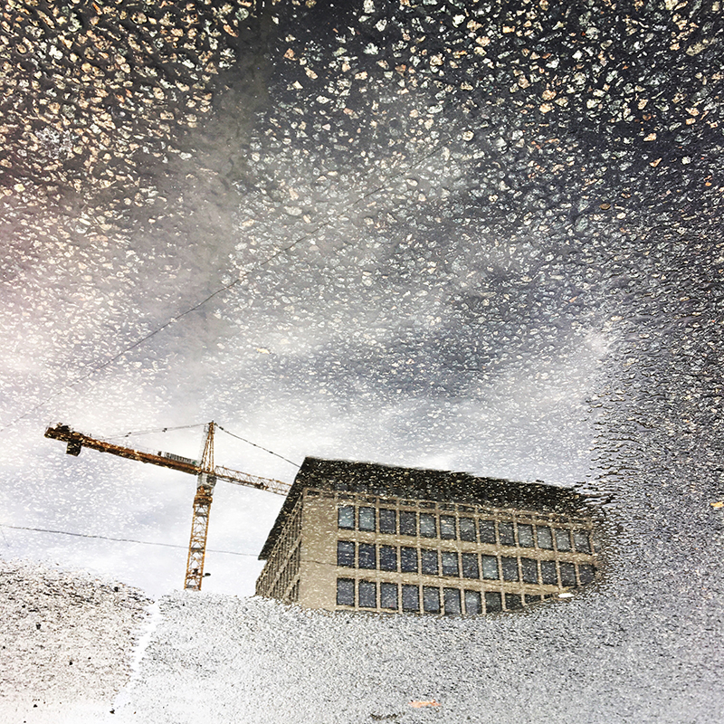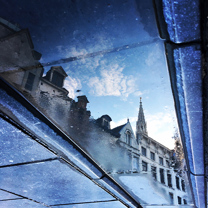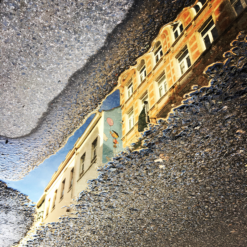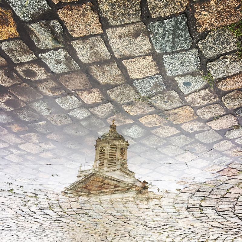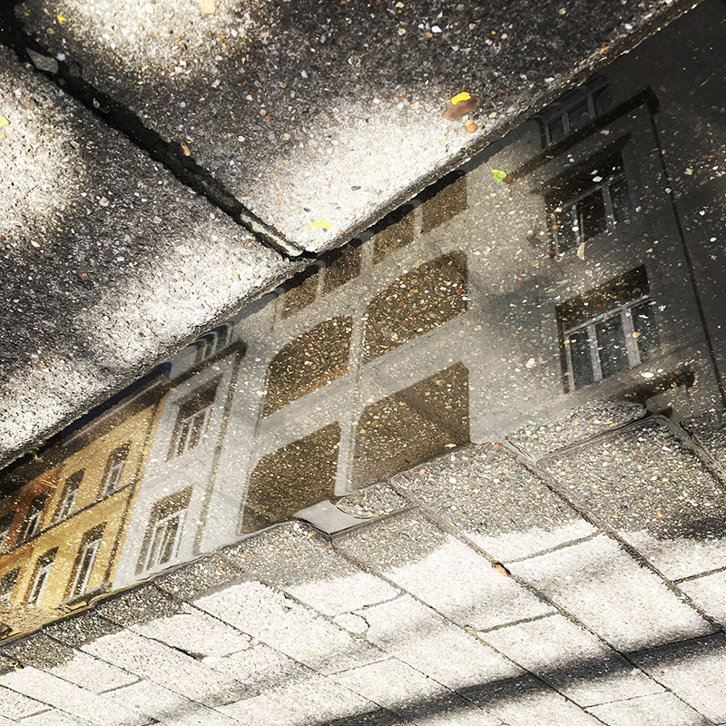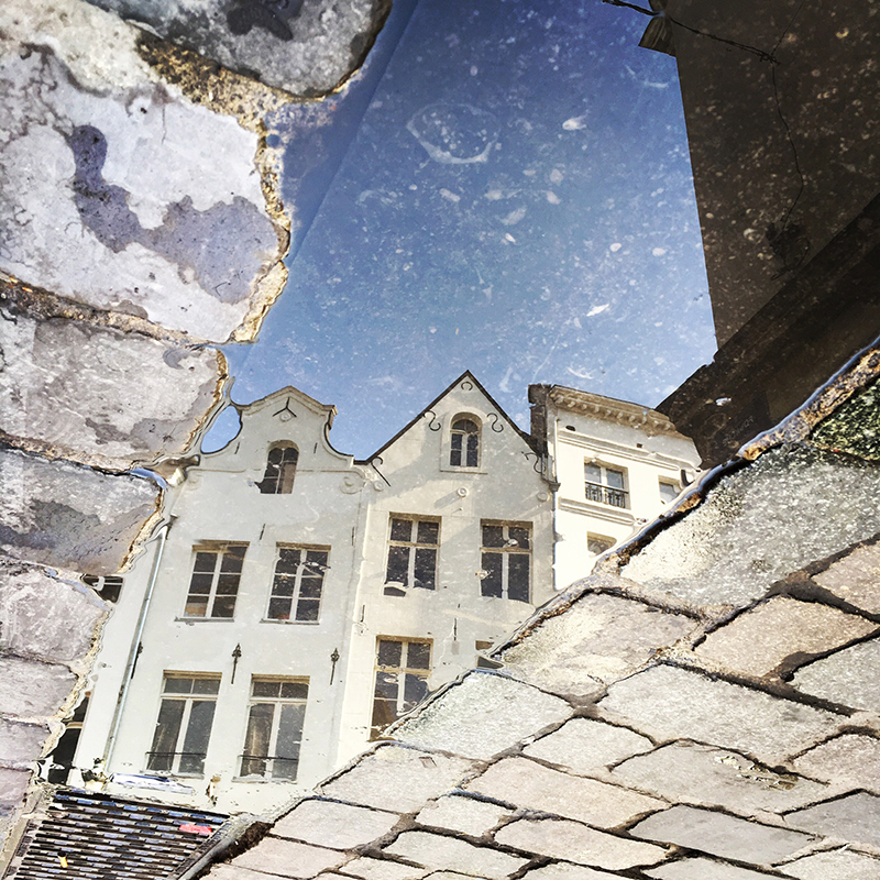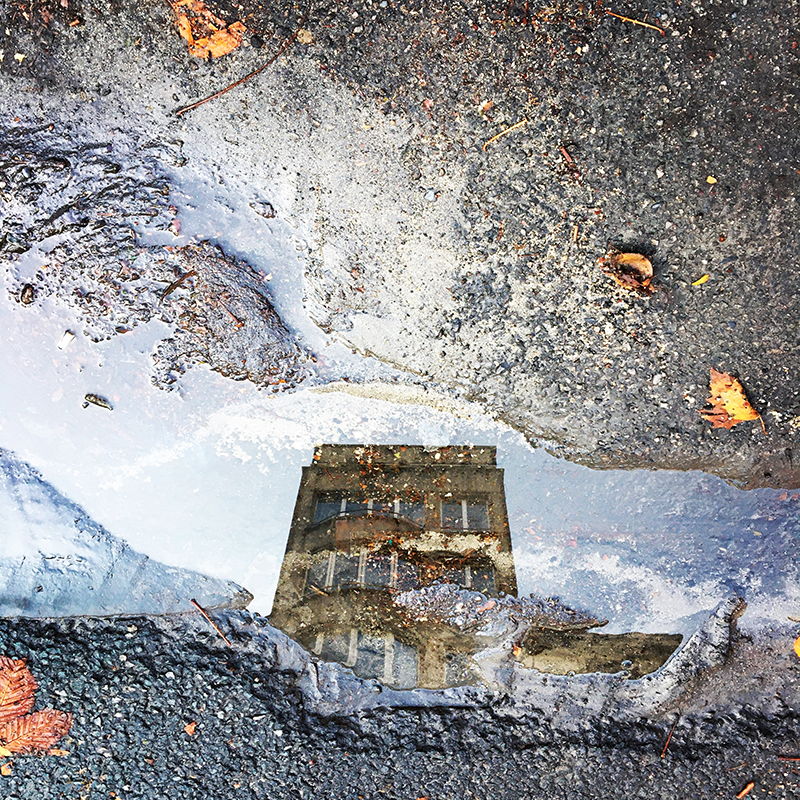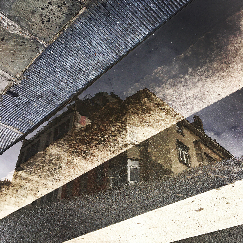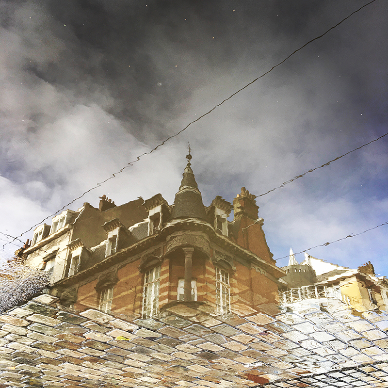 Je ne sais pas vraiment ce qui me plaît le plus dans les flaques. Est-ce leur côté éphémère ? Cette magnifique façon d’apparaître et de disparaître petit à petit. Leurs reflets qui peuvent être, selon le sens dans lequel on les regarde, complètement différents. Ou est-ce la superposition de deux univers qu’elles me laissent voir, l’espace d’un instant ? J’aime attendre la fin de l’averse pour partir découvrir cet autre monde qui me surprend toujours autant, quelque soit le jour ou la saison. Après la pluie, deux mondes vivent en suspension et on ne sait plus où mettre les pieds.